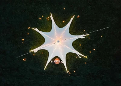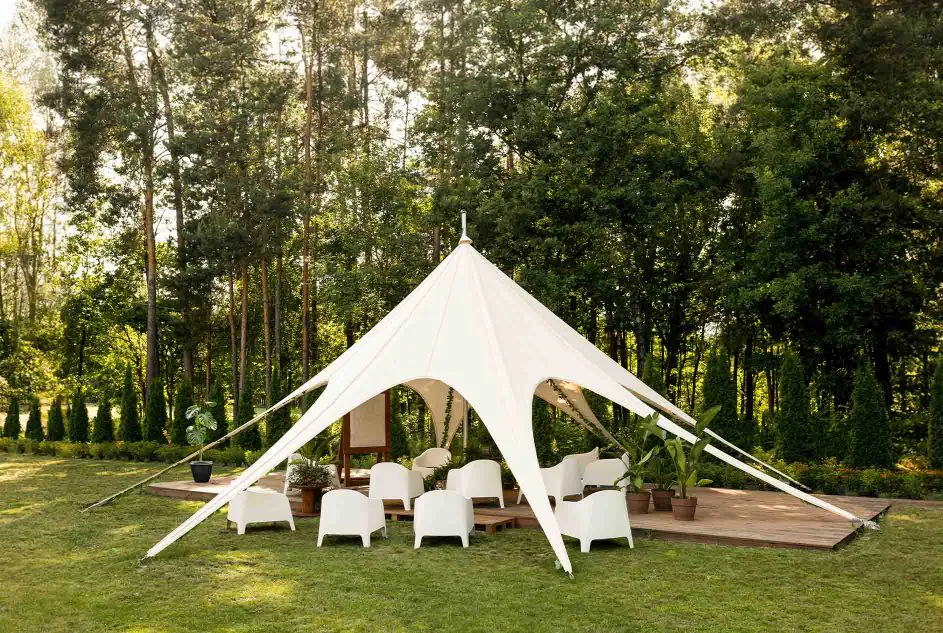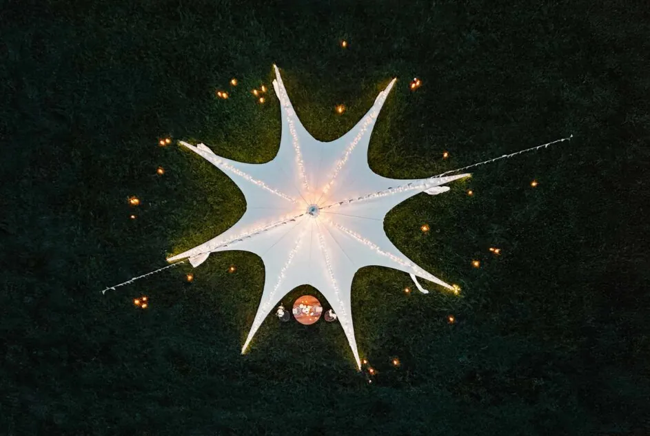 Le tissu peut être renforcé contre les UV et traité ignifuge, pour une protection et une durabilité optimales, même lors d’événements extérieurs exigeants.