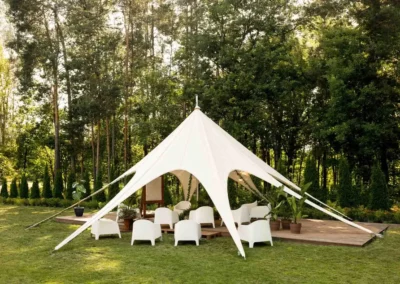 Les tentes Starshade MITKO allient élégance et performance. Leur mât central en aluminium de 76 mm de diamètre, associé à une base en acier et un ancrage solide, leur permet de résister à des rafales de vent allant jusqu’à 100 km/h.